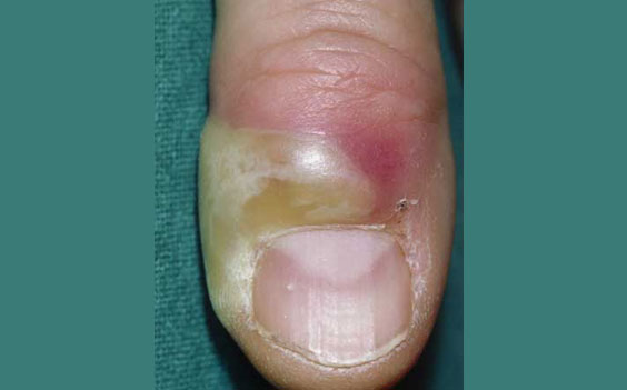 Patients with acute paronychia may report localized pain and tenderness of the perionychium. Symptoms may arise spontaneously, or following trauma or manipulation of the nail bed. The perionychial area usually appears erythematous and inflamed, and the nail may appear discolored and even distorted. If left untreated, a collection of pus may develop as an abscess around the perionychium. Fluctuance and local purulence at the nail margin may occur, and infection may extend beneath the nail margin to involve the nail bed. Such an accumulation of pus can produce elevation of the nail plate