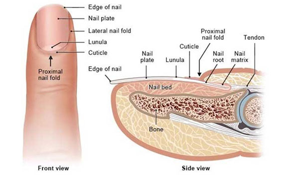 Components of the nail complex include the nail bed (matrix), the nail plate and the perionychium. The nail bed lies beneath the nail plate and contains the blood vessels and nerves. Within the nail bed is the germinal matrix, which is responsible for the production of most of the nail volume, and the sterile matrix. This matrix is the “root” of the nail, and its distal portion is visible on some nails as the half-moon–shaped structure called the lunula.The nail plate is hard and translucent, and is composed of dead keratin.The plate is surrounded by the perionychium, which consists of proximal and lateral nail folds, and the hyponychium, the area beneath the free edge of the nail.