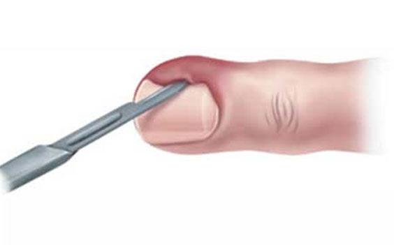 If the nerves have infarcted, anesthesia may not be required for surgical intervention.In this case, the flat portion of a no. 11 scalpel should be gently placed on top of the nail with the point of the blade directed toward the center of the abscess. The blade should be guided slowly and gently between the nail and the eponychial (cuticle) fold so that the tip of the blade reaches the center of the most raised portion of the abscess. Without further advancement, the scalpel should be rotated 90 degrees, with the sharp side toward the nail, gently lifting the eponychium from its attachment to the nail. At this point, pus should slowly extrude from the abscessed cavity. Because the skin is not cut, no bleeding should occur. Drains are not necessary. Warm-water soaks four times a day for 15 minutes should be performed to keep the wound open. Between soakings, an adhesive bandage can protect the nail area. Antibiotic therapy is usually not necessary.Recurrent acute paronychia may lead to the development of chronic paronychia.